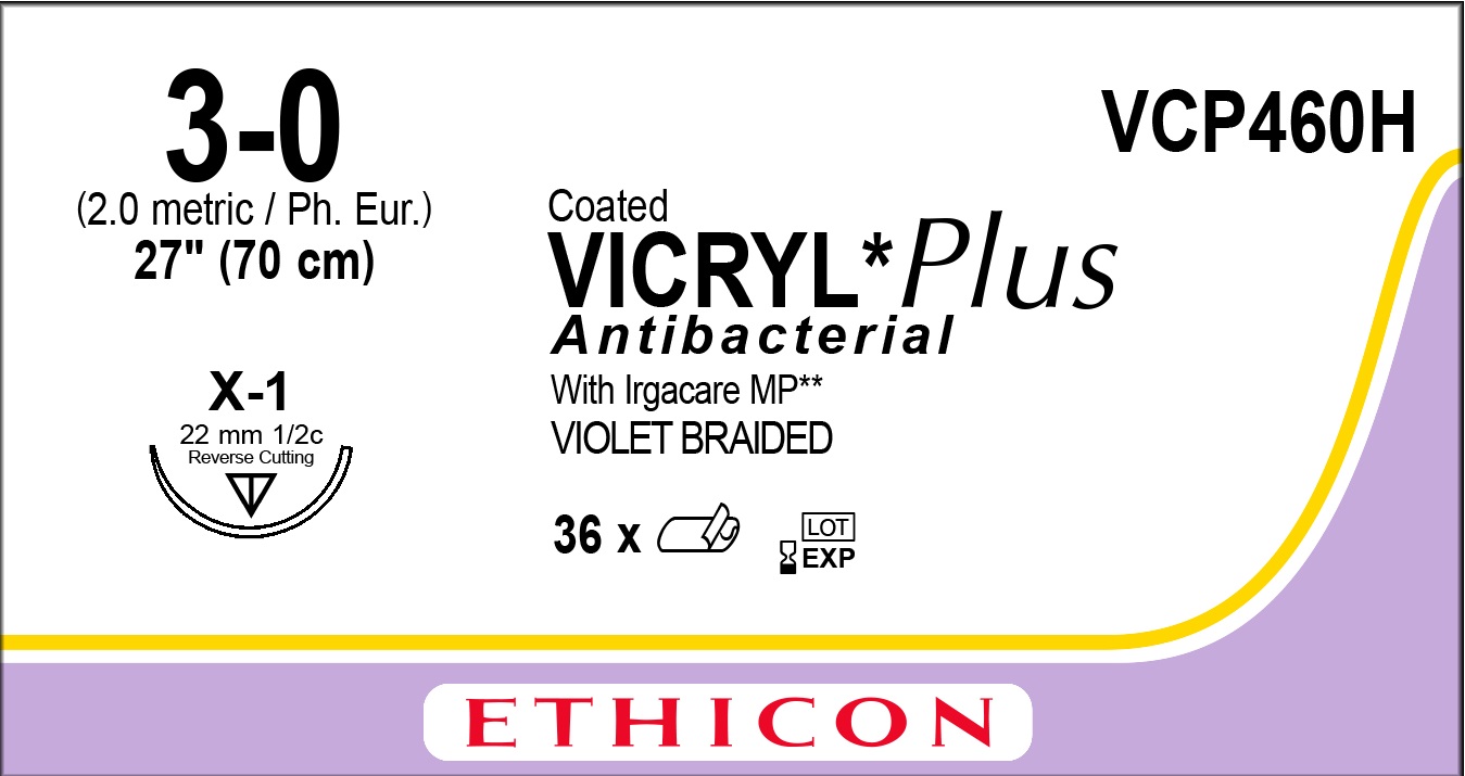 VICRYL™ Plus cod VCP460H - material de sutura chirurgicală marimea 3/0 (M2), lungime 70 cm, ac triunghi. (Reverse Cutting, X-1 Exodontal (dental)), 22 mm, 1/2 curb. Fir sintetic (Poliglactin 910) multifilament resorbabil cu acoperire antibacteriana. nr.36.