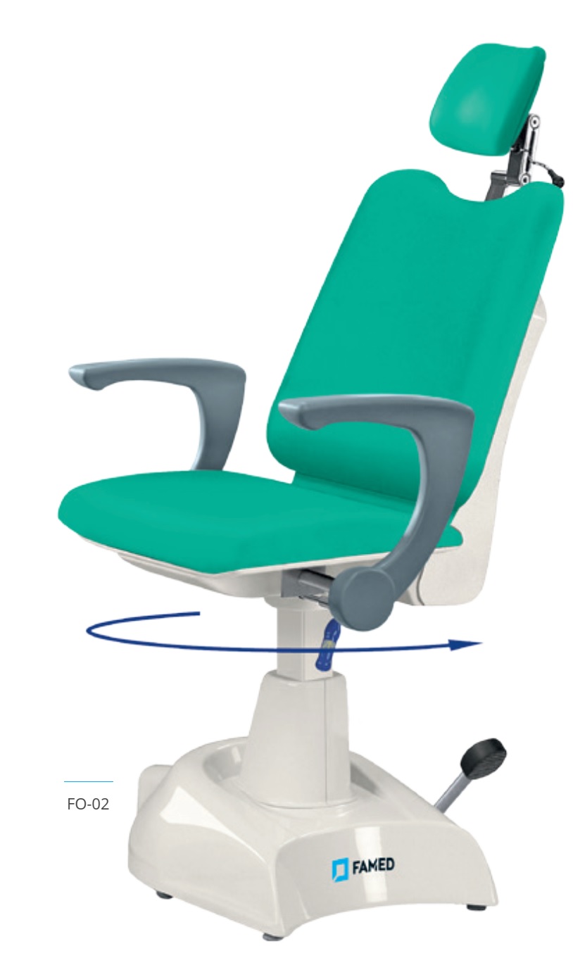 Scaunul oftalmologic Famed FO-02 e destinat fixării și menținerii pacientului în poziție șezândă și fixării poziției capului pacientului în timpul examinării laringologice sau oftalmologice. Scaunul este echipat cu reglare electrică a înălțimii și a spătarului, iar scaunul poate fi rotit la 90°.