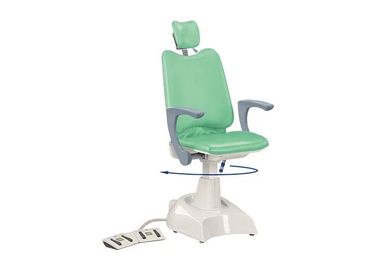 Кресла имеют возможность поворота сиденья относительно основания на 90 ° (вправо или влево). Вращение блокируется высококачественным винтовым механизмом, доступным под сиденьем. Вращение облегчает доступ к диагностическому оборудованию, что положительно сказывается на эргономике работы. Возможность наклона и снятия опор для рук позволяет на легкий и удобный доступ к пациенту. Стабильный подголовник с многогранной регулировкой положения.